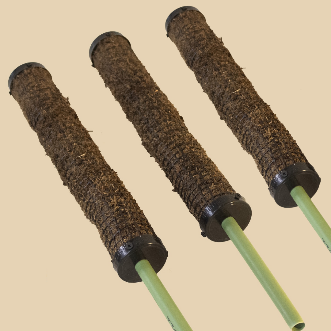 45 cm de fibra de coco y 56 cm ya con palo de soporte.